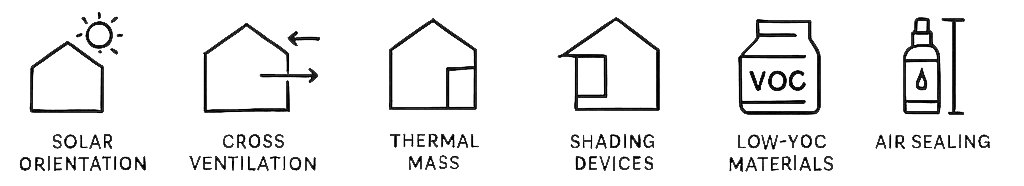 We begin with fundamentals—orientation, daylighting, thermal mass, and ventilation—to reduce energy use and enhance comfort.