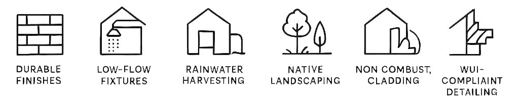 Low-flow fixtures, rainwater harvesting, greywater reuse, and native landscaping conserve water and support local ecology.