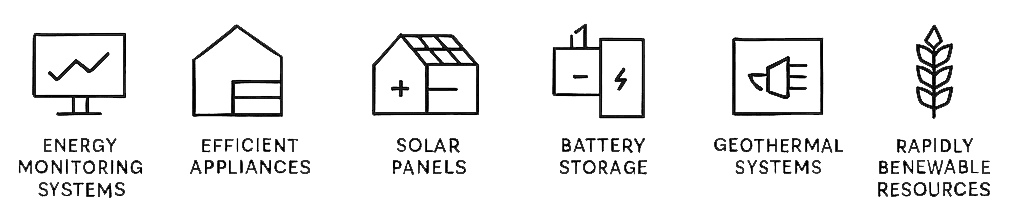 Solar panels, battery storage, and geothermal systems provide clean, resilient energy solutions.