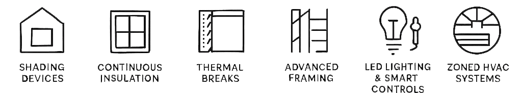 Triple-pane windows, continuous insulation, thermal breaks, advanced framing, and air barriers ensure energy efficiency and comfort.
