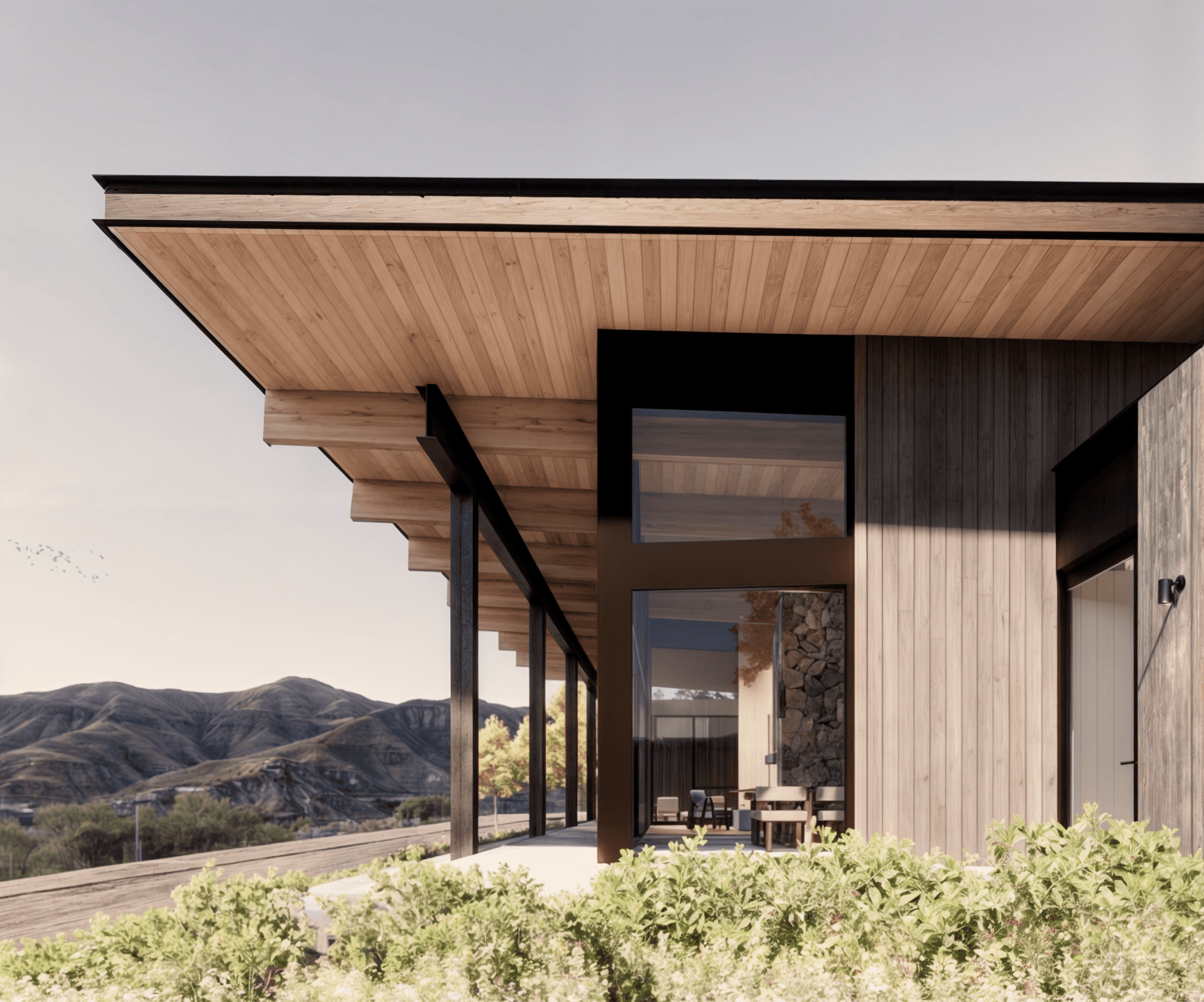A large, covered outdoor room extends the living space into the elements, offering year-round shelter and connection to place. Inside, the architecture is quiet and deliberate—structural insulated panels and exposed mass timber beams form a high-performance envelope that’s both efficient and expressive.